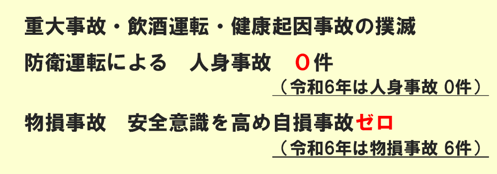 令和5年度の目標は重大事故・飲酒運転・健康起因事故の撲滅をテーマにし、人身事故0件・物損事故0件を目指し、事故防止対策に取り組んでまいりました。結果は、人身事故0件・物損事故6件でした。